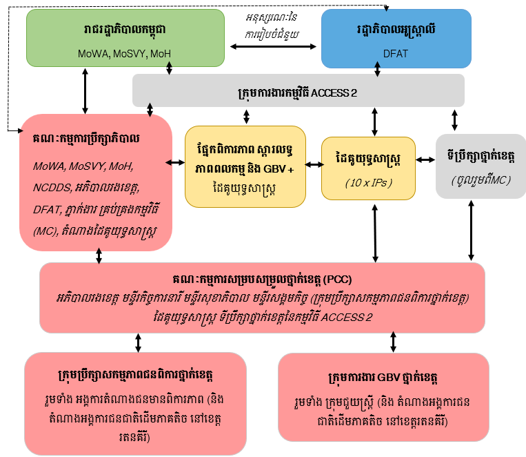 រចនាសម្ព័ន្ធអភិបាលកិច្ច ត្រូវបានរៀបចំឡើងជុំវិញការពង្រឹងភាពជាម្ចាស់របស់រាជរដ្ឋាភិបាលកម្ពុជា នៅគ្រប់កម្រិតទាំងអស់នៃកម្មវិធី ACCESS 2 ។ កម្មវិធីនេះ ក៏ធ្វើការក្នុងភាពជាដៃគូជាមួយក្រុមប្រឹក្សាសកម្មភាពជនពិការខេត្ត ដែលអភិបាលដោយរាជរដ្ឋាភិបាលកម្ពុជា (បានបង្កើតឡើងក្នុងឆ្នាំ ២០១៤) និងក្រុមការងារផ្នែកអំពើហិង្សាទាក់ទងនឹងយេនឌ័រថ្នាក់ខេត្ត (បានបង្កើតឡើងក្នុងឆ្នាំ ២០២០) ដែលជាយន្តការថ្នាក់ខេត្តដើម្បី ចូលរួមចំណែកដល់កិច្ចខិតខំប្រឹងប្រែបប្រកបដោយនិរន្តរភាពរបស់កម្មវិធីទាំងមូល។