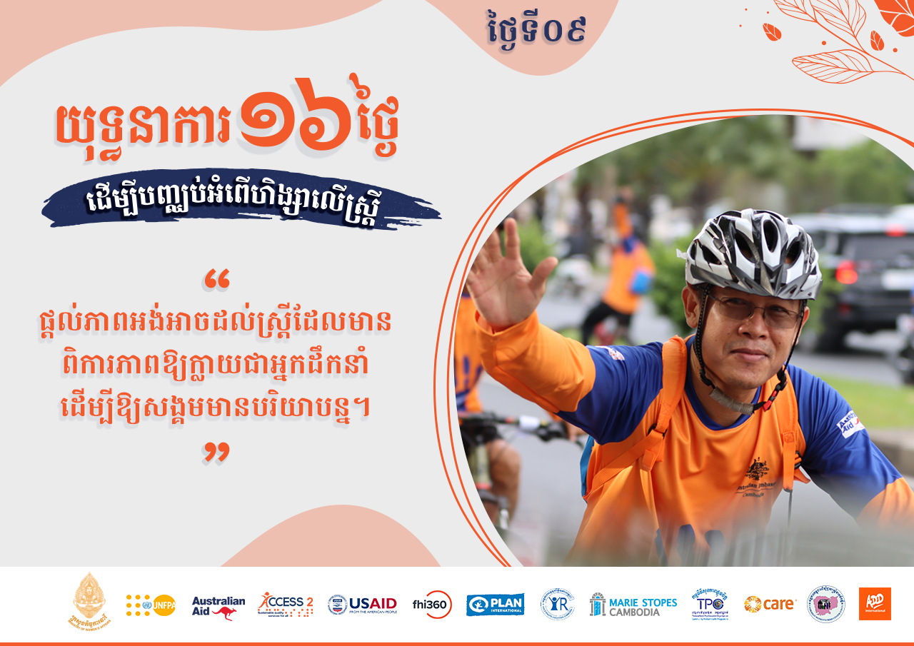 ថ្ងៃទី០៩ ប្រារព្ធយុទ្ធនាការ១៦ថ្ងៃ បញ្ឈប់អំពើហិង្សាទាក់ទងនឹងយេនឌ័រជាមួយក្រុមការងារ ACCESS 2 លោកវេជ្ជបណ្ឌិត​ ជូ វិវឌ្ឍន៍ ប្រធានផ្នែកពិការភាព និងស្តារលទ្ធភាពពលកម្ម